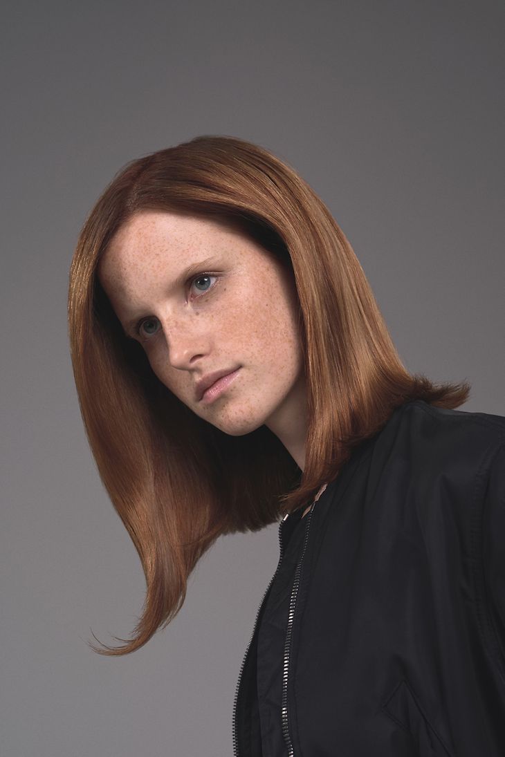 El look de salón clave muestra un corte por el hombro con un acabado elegante, con maquillaje minimalista para una sensación de frescura. El color utiliza los tonos de oro y cobre IGORA ROYAL para crear un look multitonal.