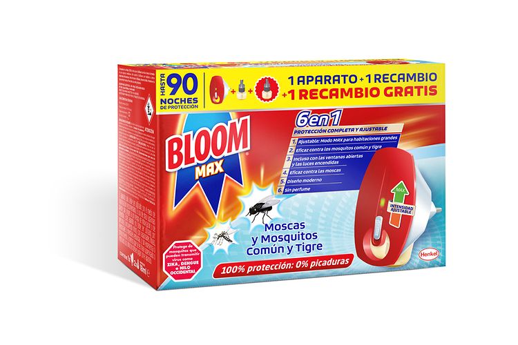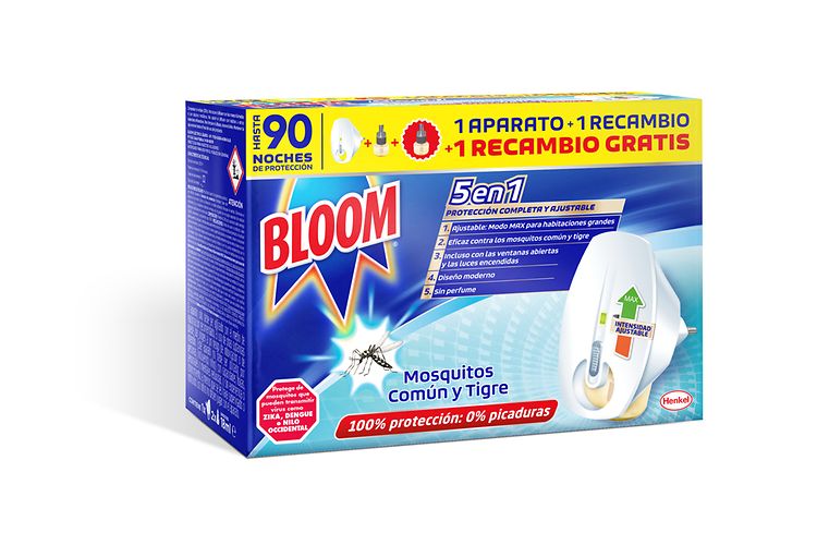 El nuevo packaging de los insecticidas eléctricos líquidos de Bloom presenta los beneficios de esta gama de productos de manera detallada ofreciendo toda la información necesaria para su óptimo uso. De este modo, Bloom Eléctrico y Bloom Max incluyen en el packaging sus respectivas fórmulas 5en1 y 6en1 con los beneficios más claros y destacados. Ambos funcionan incluso con las ventanas abiertas y las luces encendidas, y permiten regular la intensidad del difusor gracias a su tecnología con doble eficacia. Son la solución perfecta para una protección de larga duración, sobre todo para habitaciones grandes. Además, Bloom Max también es eficaz contra las moscas.